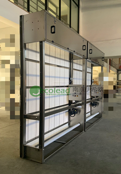 江西萍乡某环保公司采购的风管型上下式卷帘器完成交货 设备名称:风管型上下式卷帘器 设备数量:1套 发货日期:2022年1月19日 产品简介: 自动卷绕式过滤器风量:3500m3/h 1套,设备尺寸:1280W*1800H*2900D,设备材质:2.0mmt SUS 304,380V ExdIIBT4 IP55 550W防爆电机,初效滤料:卷帘过滤器专用G3滤料,二道过滤:F6袋式过滤器,三道过滤:F9袋式过滤器,配套安装固定辅件、配套压差计。控制系统:PLC时间压差自动和手动控制,应预留电机故障和滤料用尽报警的无源干接点。 产品应用领域 纺织厂空调回风过滤 设备冷却用工业通风 冶金行业烧结系统净化 中央空调进风系统预过滤 煤炭行业坑道大风量通风 污水处理厂鼓风机进风过滤 高速公路设备机房或涵洞通风 发电厂燃气轮机进风系统预过滤 含尘量高,需频繁更换滤料的环境; 恒定风量的运行系统。